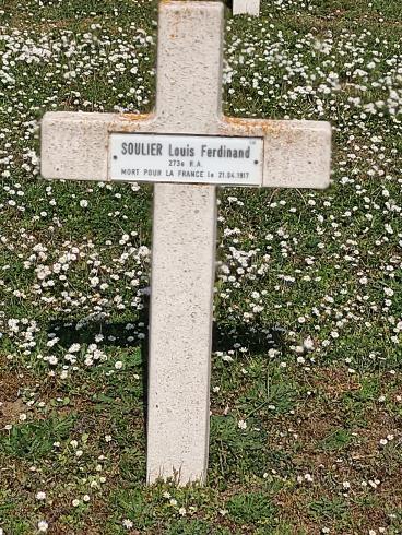 "à 22 h deux conducteurs de la 42e batterie sont mortellement blessés en position par éclats d'obus de 105, (...) le 2ème (Soulier Louis) plaies multiples sur tout le corps et fracture des deux jambes."